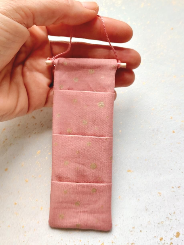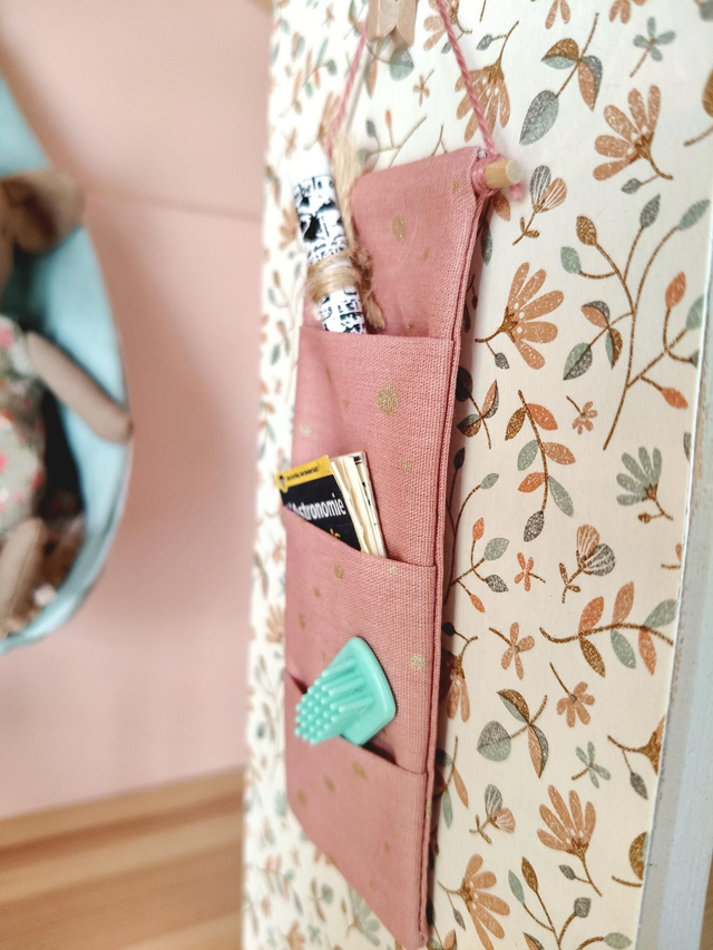Il est composé de 3 pochettes en coton rose à pois dorés, à accrocher facilement sur un mur de maison de poupée.